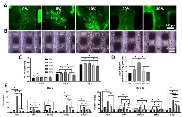 各组支架均出现PCL的特征峰,其中2850-3000cm-1处–(CH2)4–为CH伸缩振动,1750cm-1处是C=O伸缩振动峰,1150-1250cm-1代表-C-O-。随着MBG含量的增加,PCL原有的特征峰逐步降低。通过对各组支架进行热重分析,支架剩余无机颗粒的质量与混入MBG的比例基本一致。在支架的抗压缩性能测试中,我们可以看到随着MBG含量的增加PCL的抗压能力逐渐增强。以10%最显著。但在此基础上,随着MBG含量的增加支架的抗压强度逐步下降。20%和30%支架在达到抗压峰值后迅速坍塌。这是因为PCL包裹MBG颗粒类似于“海-岛”结构。我们推测,当MBG(“岛”组分)含量进一步增大时,对PCL(“海”组分)的整体连接性能产生了不利的影响,进而降低支架的最大抗压强度。同时,较大比例的MBG在PCL中团聚,使得抗压形变过程中受力不均导致支架整体坍塌。