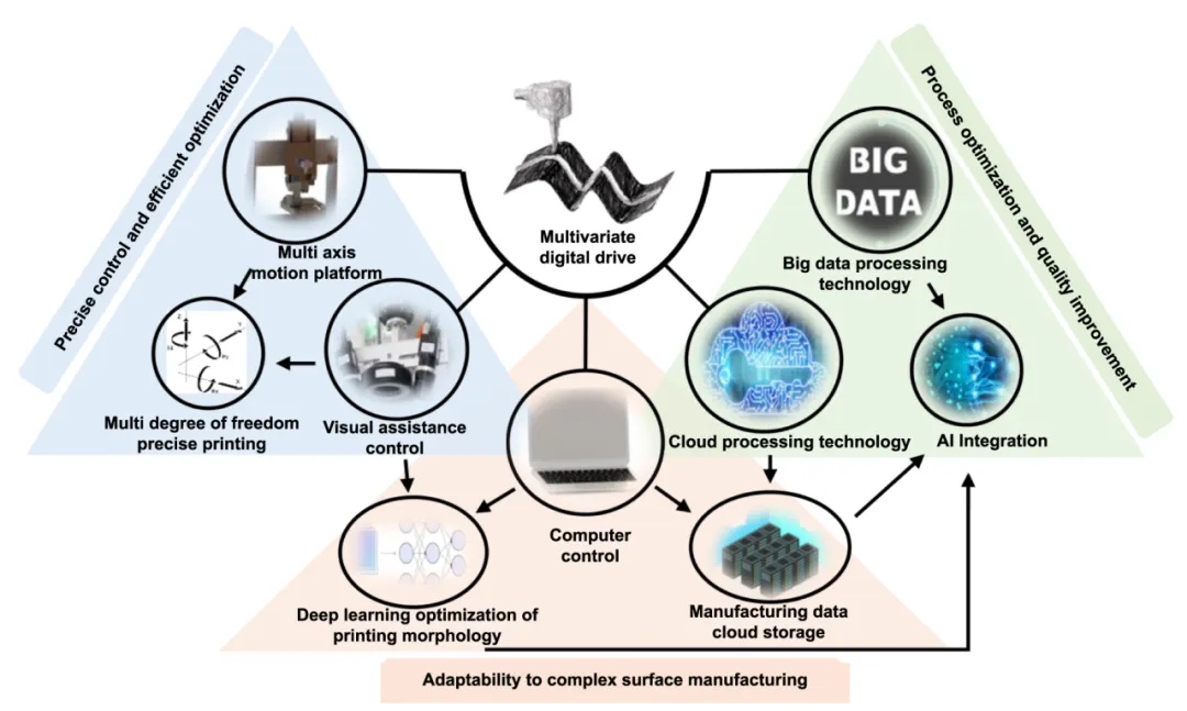 喷墨式随形增材制造技术与机器学习(ML)和人工智能(AI)等数字化驱动技术的结合,实现了智能化的制造控制。这种集成优化了液滴喷射、复杂基材上的精确沉积以及错误管理,为高难度制造任务提供了解决方案。