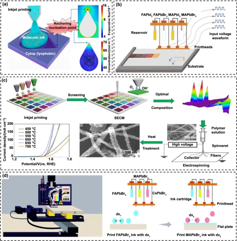 喷墨打印可与其他制造工艺(如选择性激光熔化)结合,支持高通量材料筛选,加速新材料的发现和应用。例如,在可再生能源存储领域,喷墨打印帮助快速筛选固体电催化剂,并加速新型钙钛矿薄膜的发现(如下图b-d所示)。这种高通量筛选能力为随形制造中的材料开发提供了独特优势,特别是在不同流变特性的基材上。