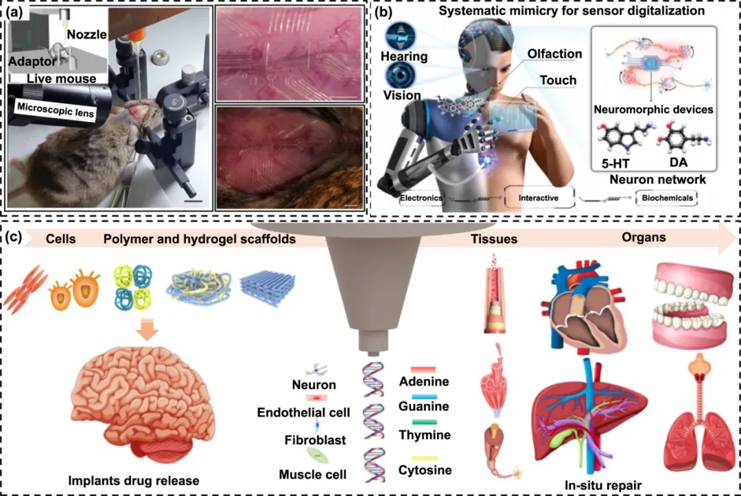 喷墨增材制造技术在生物制造中的应用,特别是在软神经探针和微电极阵列的制造中,提升了电子设备与生物系统的整合性。此外,生物打印像素的概念为喷墨打印技术在生物材料植入和器官修复等领域开辟了新途径。