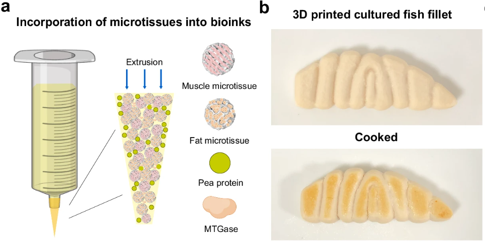 △基于微载体的细胞微组织生物墨水的特性,采用 BioRender 创建。b:生鱼片和熟鱼片 3D 打印养殖鱼片原型的外观。图片来自中国海洋大学。