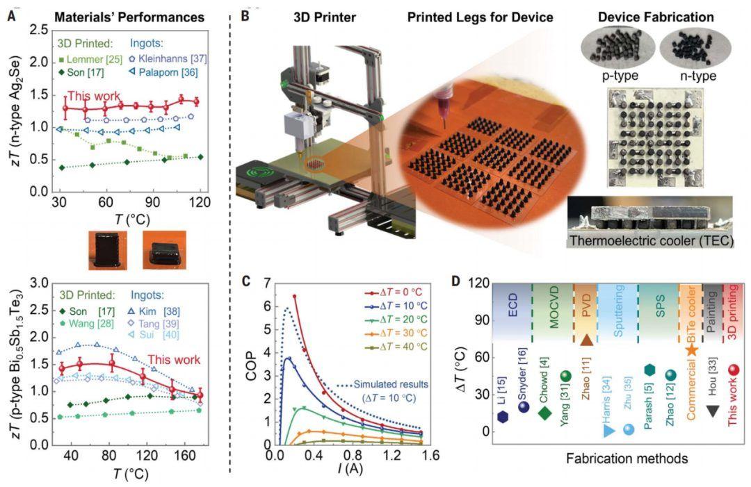 打印技术,并设计了油墨配方,以确保打印结构的完整性并促进颗粒结合。这使我们能够从打印材料中生产出首批热电冷却器,性能与基于锭的设备相当,同时节省了材料和能源。”