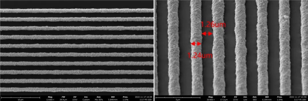 PI介质表面精密RDL线路(线路中心距2.5um,线路后处理条件:300℃ 1h 空气氛围烧结)。