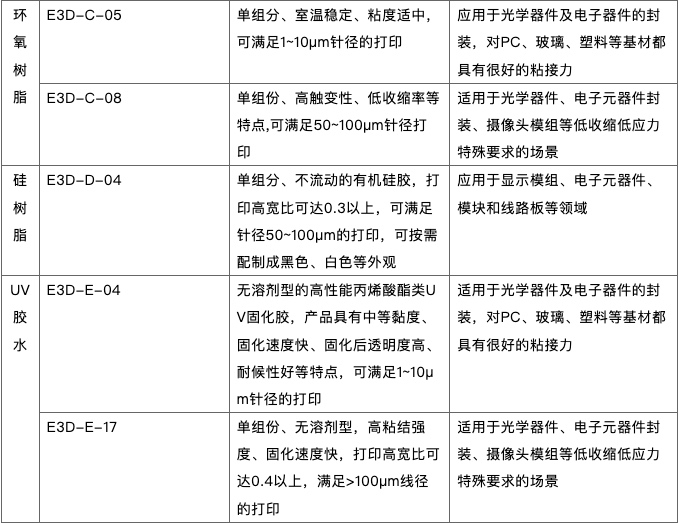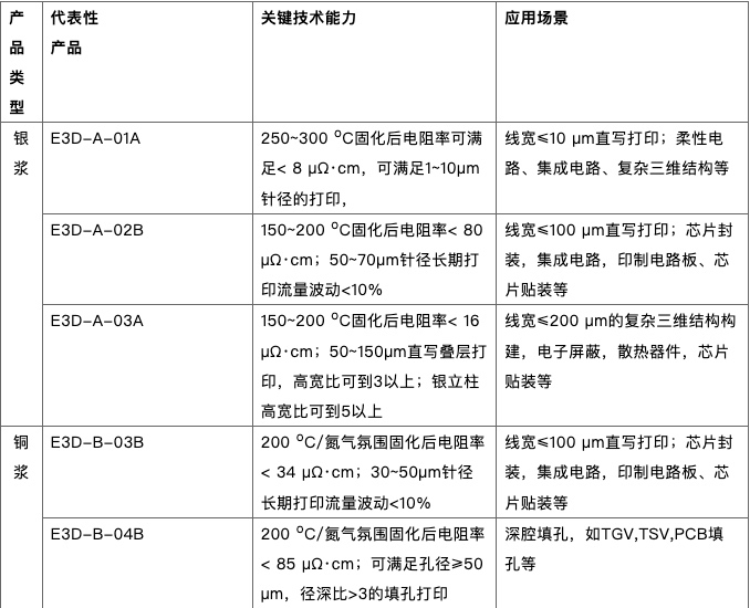 微米精度电子增材制造的先进功能材料体系,含括高性能金属浆料体系、高性能树脂浆料体系、有机复合材料体系,根据客户需求的定制化开发,可满足显示、半导体封装、锂电等行业内微米级线路加工、深腔填孔、特殊三维结构构造等应用场景。