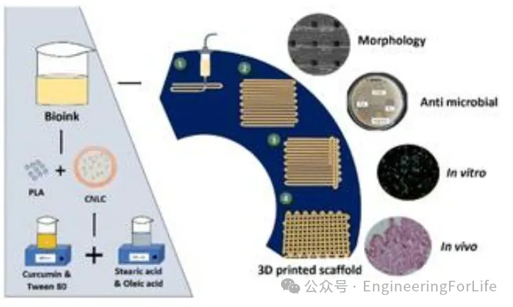 Vidyavathi等制备了一种基于3D生物打印的聚乳酸(PLA)支架,该支架内嵌载有姜黄素的纳米结构脂质载体(CNLC),用于皮肤再生和伤口愈合的研究。