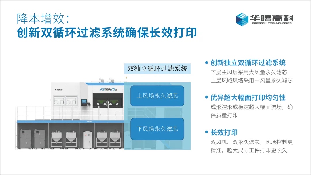 此外,FS1521M系列采用固定式上下双层独立结构的创新双层风场设计,配合创新双循环过滤系统,标配永久滤芯,有效解决了超大跨距烟尘去除的难题,实现了高均匀稳定性的风场和长效打印。同时,人粉无接触的设计也解决了超大工件打印中的巨量粉末管理和安全问题。