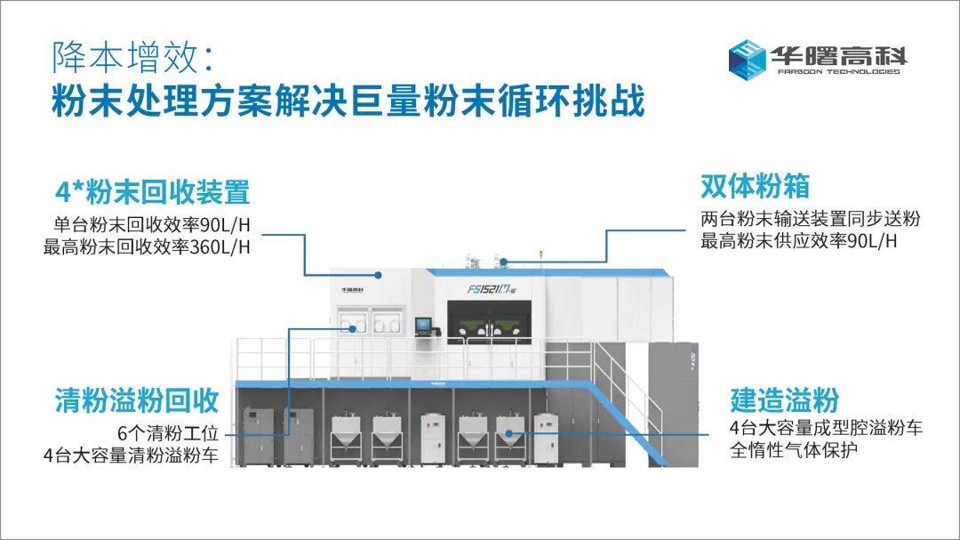 在降本增效方面,FS1521M系列同样表现出色。它配置了4台建造溢粉和4台清粉溢粉箱,以及最多4台粉末回收装置,单台粉末回收效率高达90L/H,最高粉末回收效率可达360L/H。