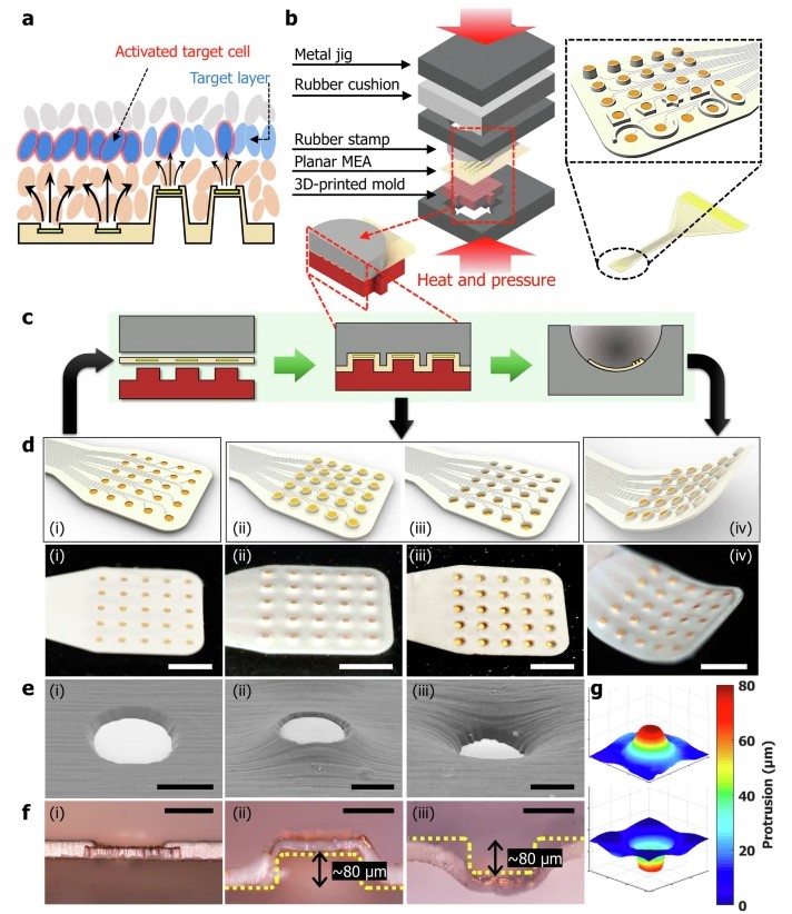 μETF 方法包括加热嵌入微电极的薄而柔韧的聚合物片,并压在 3D 打印模具上。研究人员使用液晶聚合物 (LCP) 作为基材,因为它具有机械强度、生物相容性和长期稳定性。基于上述过程可形成精确的凸起和凹陷结构 - 增强电极与目标神经元的接近度,同时保留电性能。与传统的微加工方法不同,μETF 简化了制造过程,并允许在单个 MEA 内实现各种复杂的 3D 结构,包括井、圆顶、墙壁和三角形特征。
