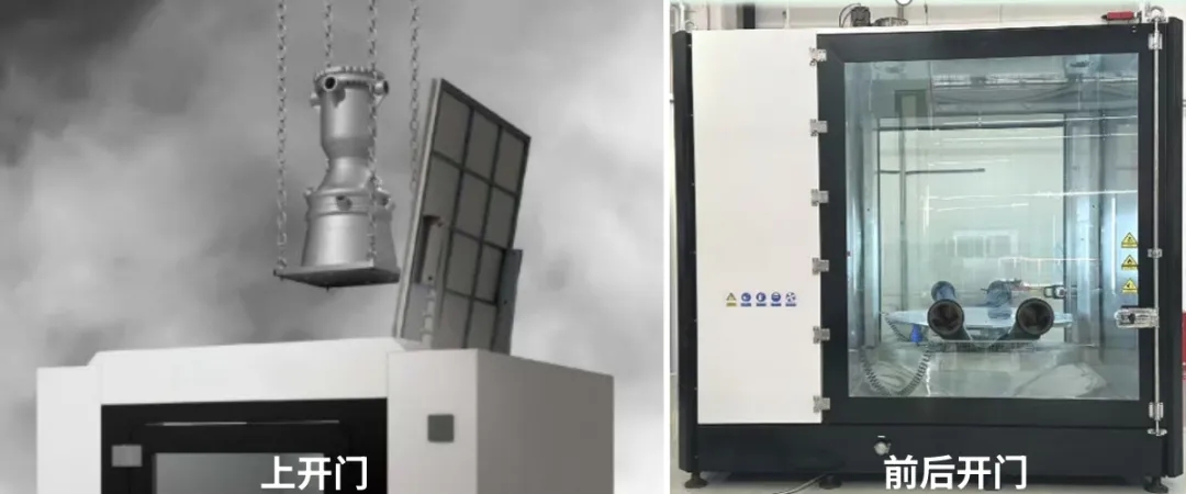 上开门的设计:直接让打印件从打印机到清粉机,减少中间环节,减少污染,前后开门便于叉车的安装,方便人员安装基板。