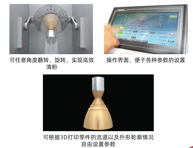 振动装置和吸尘枪等套件一起配合使用,清粉效率更高。设备通过振动装置让工件产生振动,把密实的粉末振得松散,容易脱落。吹尘枪套件能高压吹扫吸尘空间里的粉末,还有吸粉接口,可以直接对接吸粉设备回收粉末。这样一来,就算是结构超复杂的工件,也能轻松完成清粉,粉末还能有效回收,不会污染环境,也不会危害人体健康。