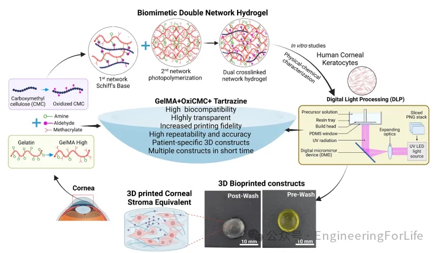 Vijayavenkataraman及其团队首次报道了一种由明胶甲基丙烯酰(GelMA)和氧化羧甲基纤维素(OxiCMC)双交联油墨组成的互穿网络(IPN),用于使用数字光处理(DLP)技术生物打印角膜基质等效物(CSEs)。