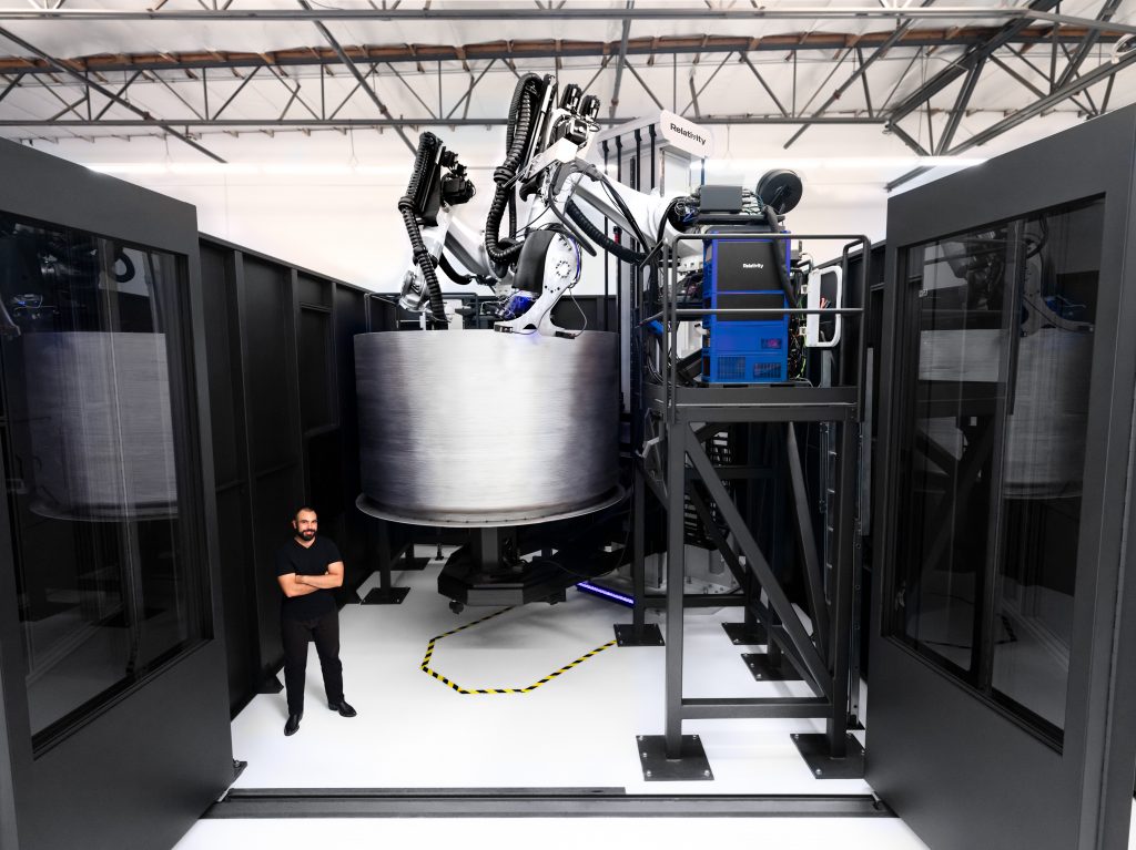 △RelativitySpace 联合创始人兼前首席技术官乔丹·诺恩 (JordanNoone) 与星际之门 3D 打印机合影。照片来自Relativity Space