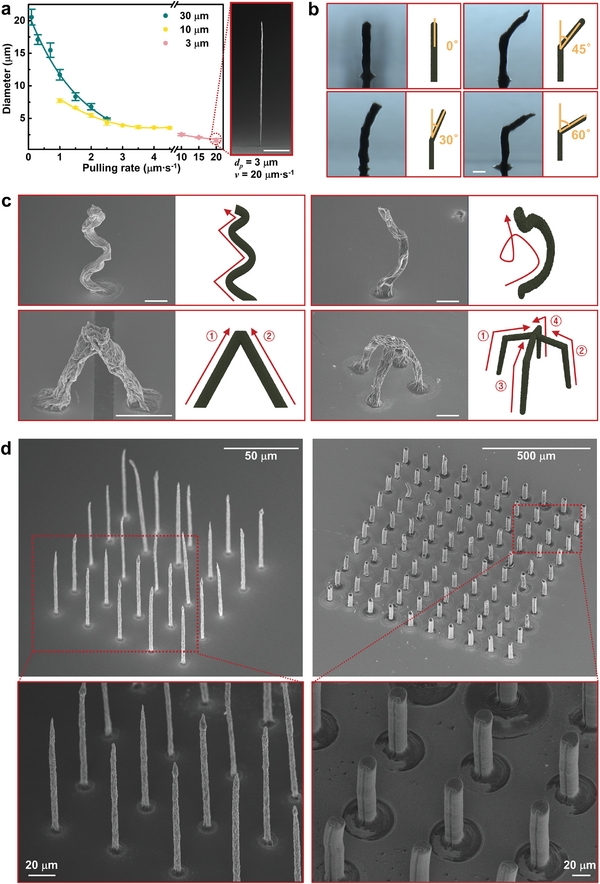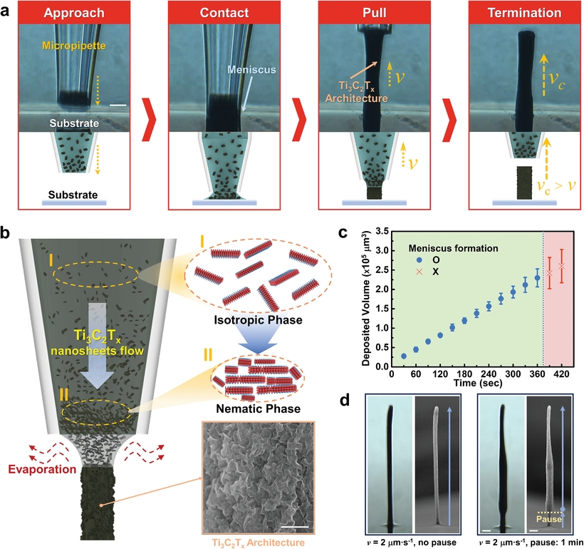 研究团队通过将亲水性极强的MXene散在水中(无需添加粘合剂),制备出了一种适用于 3D打印的纳米墨水。这种墨水能在低粘度条件下实现高分辨率微结构的打印,从而克服了传统打印技术的局限性。打印原理相对简单:当含有MXene纳米材料的墨水从3D打印机的喷嘴喷出时,弯月面效应充当了材料喷出的通道。在这一过程中,溶剂(水)迅速从弯月面表面蒸发,而内部的范德华力则促使纳米材料紧密结合。通过连续移动喷嘴并重复这一过程,可构建出导电的3D微结构。