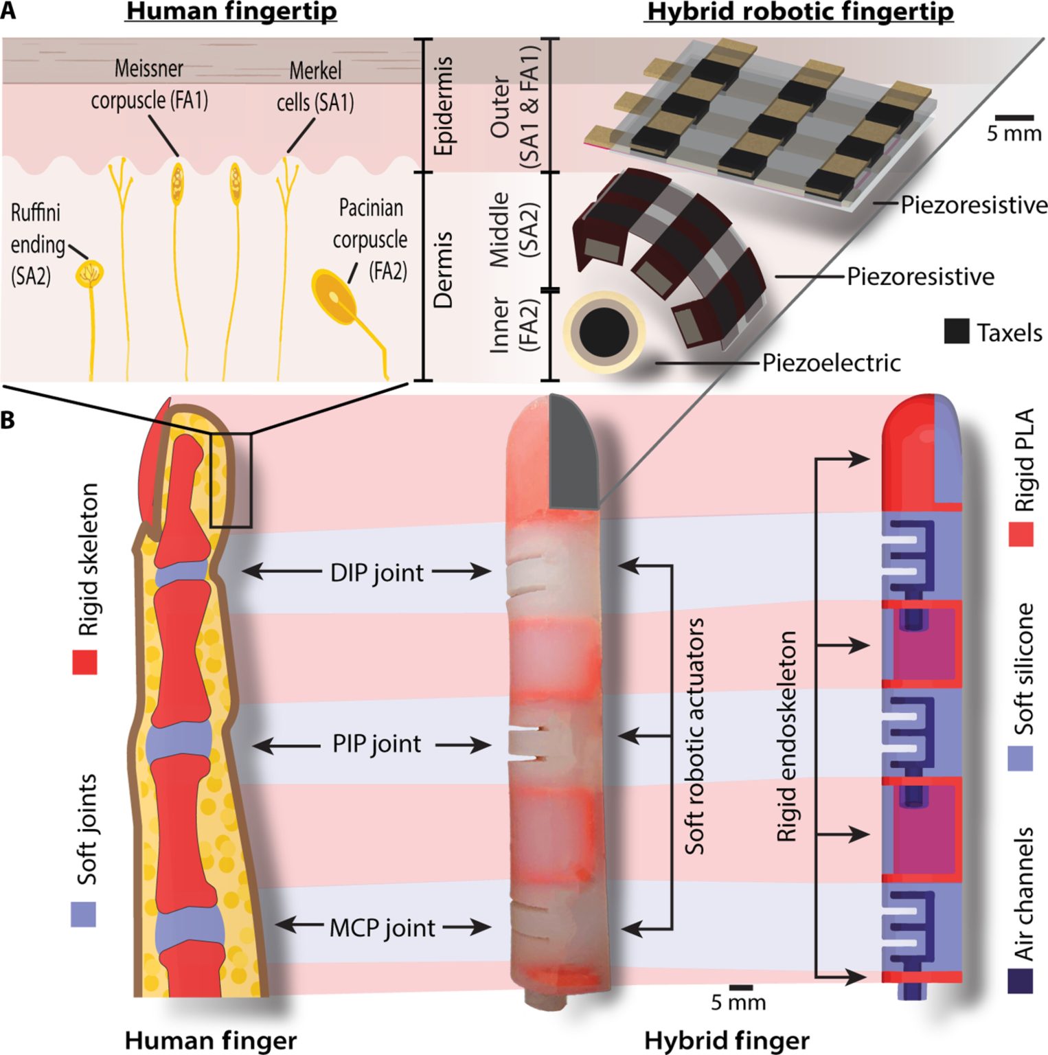 这些包括对轻触和变形敏感的压阻层,以及用于检测细微振动的压电层,模仿人类手指复杂的感官体验。混合机器人手指包含三个独立驱动的软关节,由化学制造公司Smooth-On的Dragon Skin 10 硅胶制成,并由 3D 打印的聚乳酸 (PLA) 刚性骨骼结构支撑。有限元分析和实际测试表明,混合手指在仅 7 psi 的驱动压力下即可实现显著的灵活性,曲率达 130°,屈曲角度达 208°。与通常需要更高压力的纯软机器人手指相比,这显然更加高效。Sankar说:“如果你手里拿着一杯咖啡,你怎么知道它就要掉下来了?你的手掌和指尖会向大脑发出信号,告诉你杯子正在滑落。我们的系统是受神经启发的——它模拟手的触觉受体来产生类似神经的信息,这样假肢的‘大脑’或计算机就能知道某物是热的还是冷的、软的还是硬的,或者是否从握柄上滑落。”