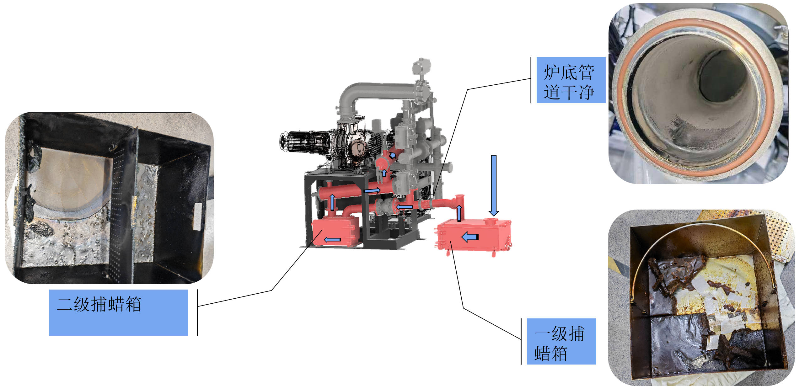星特烁创新性地采用了四级捕蜡管道设计,有效防止蜡蒸气返流,确保炉内气氛纯净,显著减少炉内产品的增碳问题。该设计包括一级捕蜡箱、二级捕蜡箱、三级捕蜡管道和四级捕蜡管道,形成完整的蜡气捕捉系统。