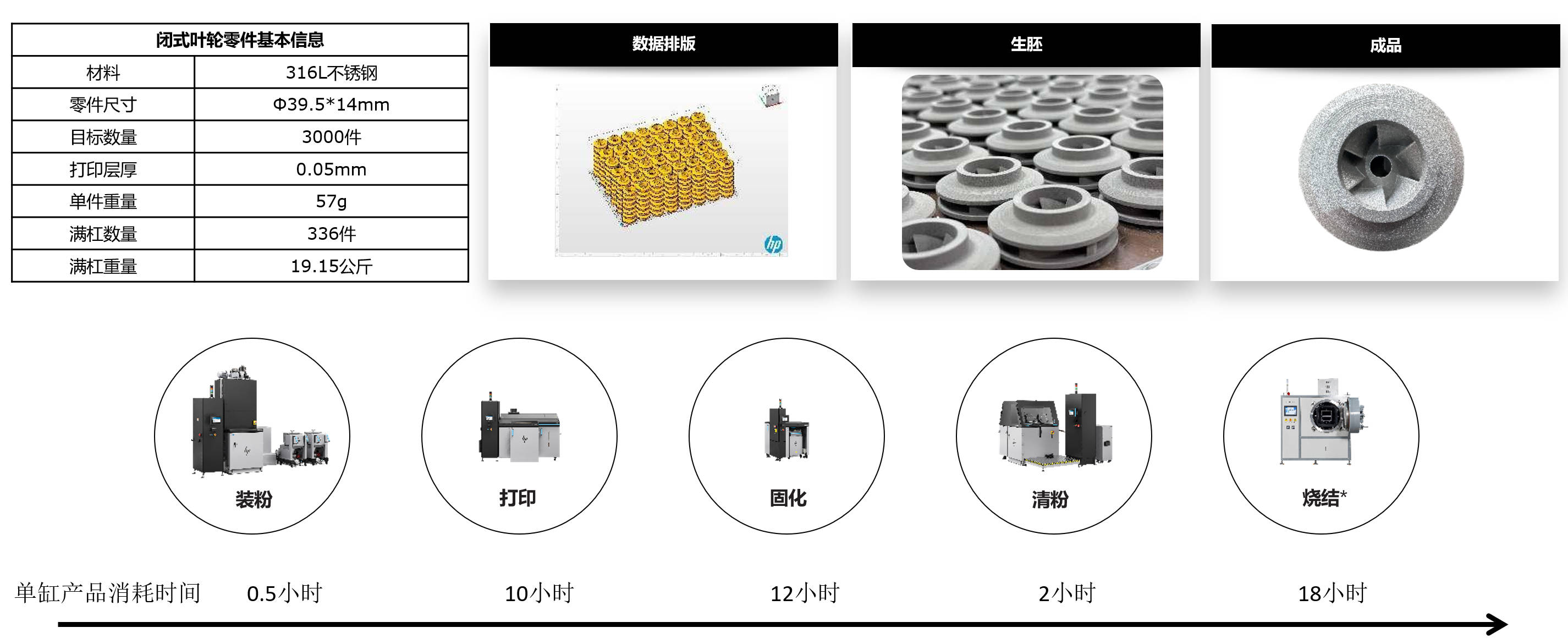 该系统已在多家企业成功应用。以东莞必极公司为例,其使用星特烁系统生产316L不锈钢闭式叶轮,在10天内完成了3000件产品的生产,展现了系统在规模化生产中的强大能力。产品经过装扮(0.5小时)、打印(10小时)、固化(12小时)、清粉(2小时)、烧结(18小时)等工序,总共打印11缸,烧结2炉即完成了全部生产任务。