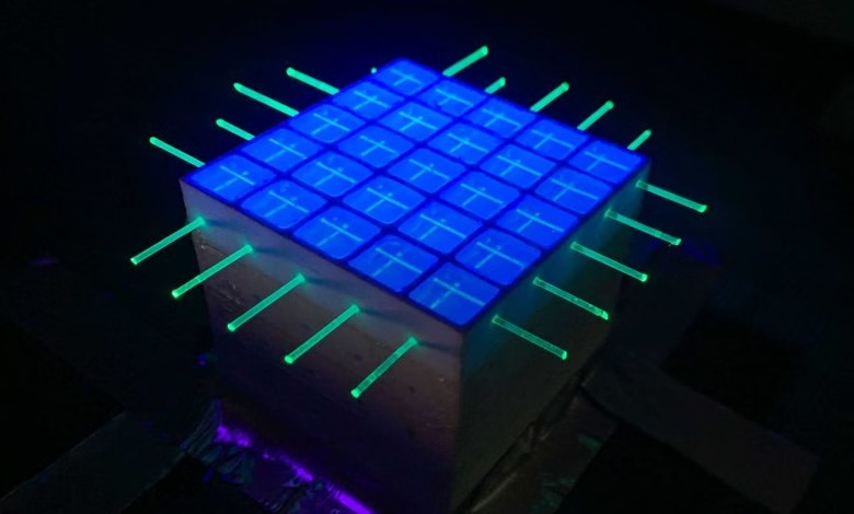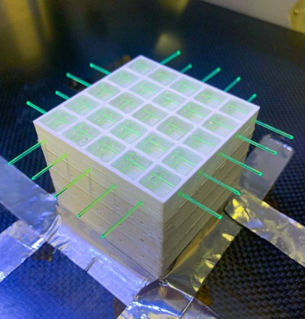 PS探测器能够以高精度跟踪带电粒子。该材料包含荧光发射体(荧光体),能够吸收粒子能量并发射近紫外光。第二种荧光体会改变这种光的波长,使得光纤能够有效地捕获和传输光信号。为了实现精确跟踪,3D闪烁探测器必须由光学隔离单元组成,类似于数字屏幕中的像素。研究团队在开发中微子探测器SuperFGD时面临的挑战之一是选择合适的材料,并找到一种能够保持透明度和结构完整性的增材制造工艺。