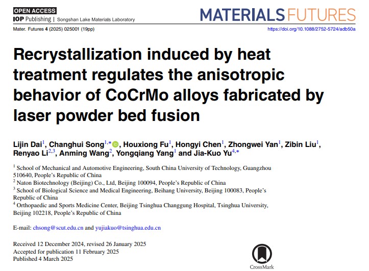 2025年3月17日,来自华南理工大学和北京清华长庚医院的研究人员分析了热处理工艺对激光粉末床熔融 (LPBF) 制造CoCrMo 合金各向异性行为的影响,重点研究了微观结构变化、机械各向异性和残余应力降低。研究探索了在 1150°C 下进行 1 小时的固溶处理,然后在 450°C 下进行 0.5 小时的退火,如何改变晶粒形态、抗拉强度和伸长率。相关研究以题为“Recrystallization induced by heattreatment