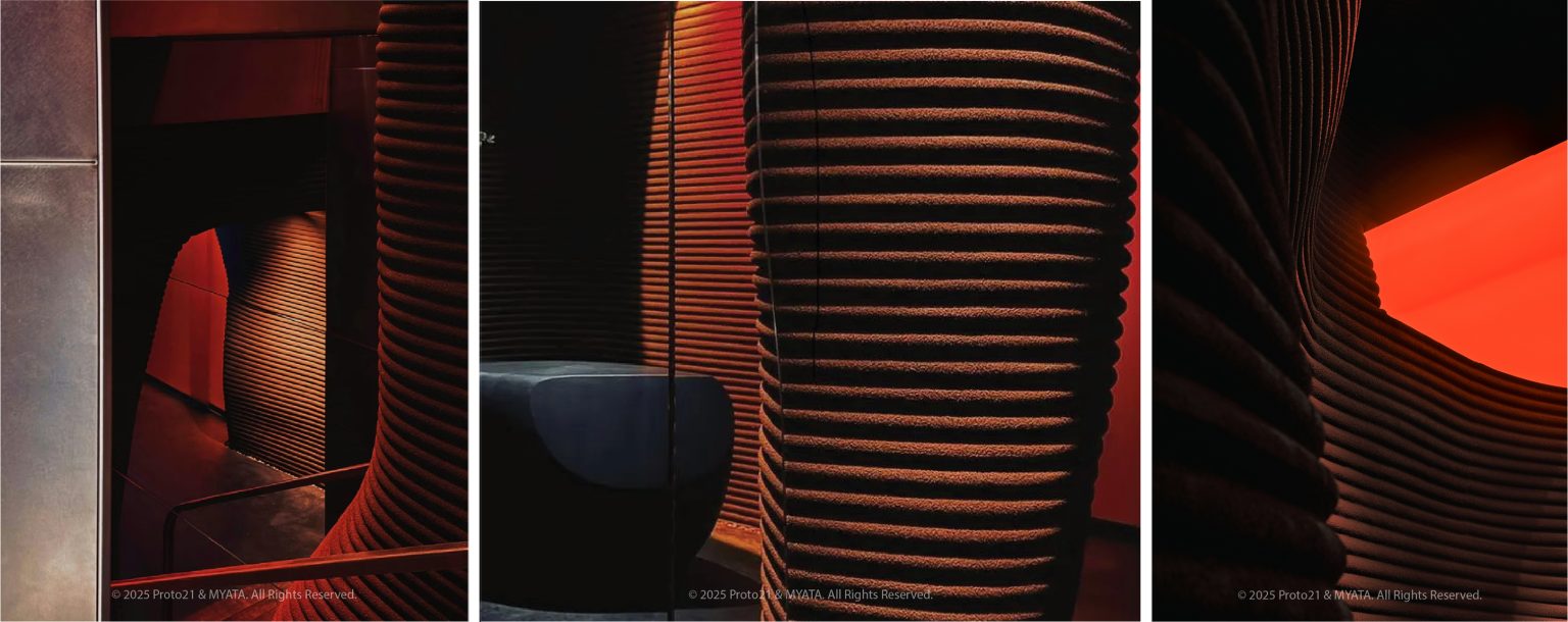 MYATA 占地 100 平方米,包括入口区、洞穴和墙面,全部形成一个统一的结构。建筑结构长 15.73 米,宽 6.78 米,并设有 8.6 米的楼梯立面。设计采用了 23 个大型 3D 打印模块,包括贵宾室、柜台、花坛和外立面,其中一个模块创下了世界纪录。建筑设计从峡谷景观中汲取灵感,每个元素都使用 Blender 手动建模,以创建独特的沉积图案。Arkam 强调了项目的复杂性,并指出:“92% 的作品都是独一无二的,这意味着几乎没有重复。这是传统制造业无法实现的。”