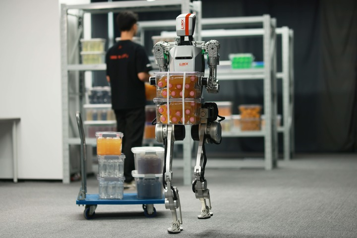 在深圳逐际动力科技有限公司,人形机器人CL-1进行大负载搬运任务。(资料照片)