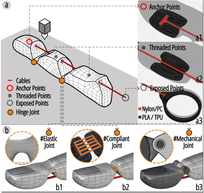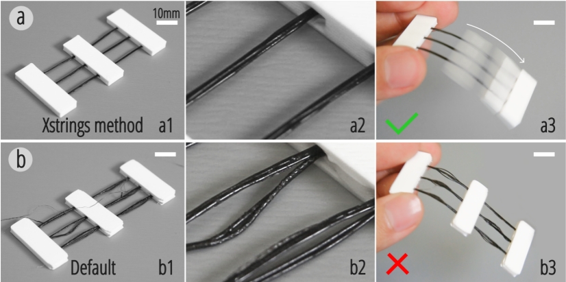 传统电缆驱动机制的设计和制造需要复杂的装配(如钻孔、穿线、打结),而研究人员开发的Xstrings软件通过双材料FDM
