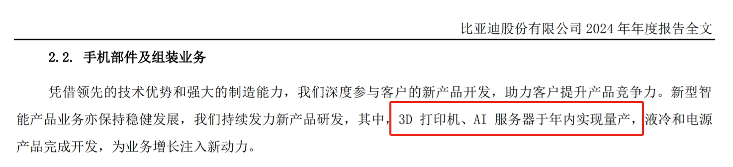 在比亚迪董事长的致辞当中,提到了两大核心板块业务,包括汽车业务和手机部件及组装业务,而在手机部件及组装业务当中提到了3D打印机,2024年“比亚迪3D打印机、AI服务器于年内实现量产”。这对3D打印行业来讲可是一个大消息,因为此前并未有相关的信息透露,突然就宣布已经实现了3D打印机量产。