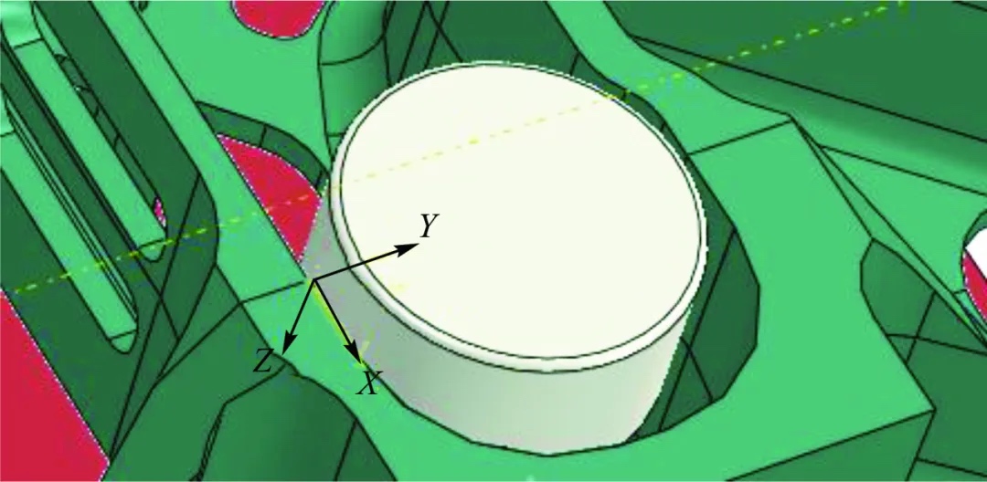 利用ABAQUS分析软件,根据导向轮槽的两种载荷工况建立有限元分析模型。由于零件采用不规则拓扑优化结构,模型选用适应性强的二阶四面体网格单元,总数为336653(图4)。通过建立与导向轴尺寸一致的圆柱结构模拟加载条件(图5),将螺栓孔周围节点与参考点建立Coupling约束固定模型(图6),并建立底板结构模拟周围结构的支撑作用,底板与导向轮槽建立接触属性。