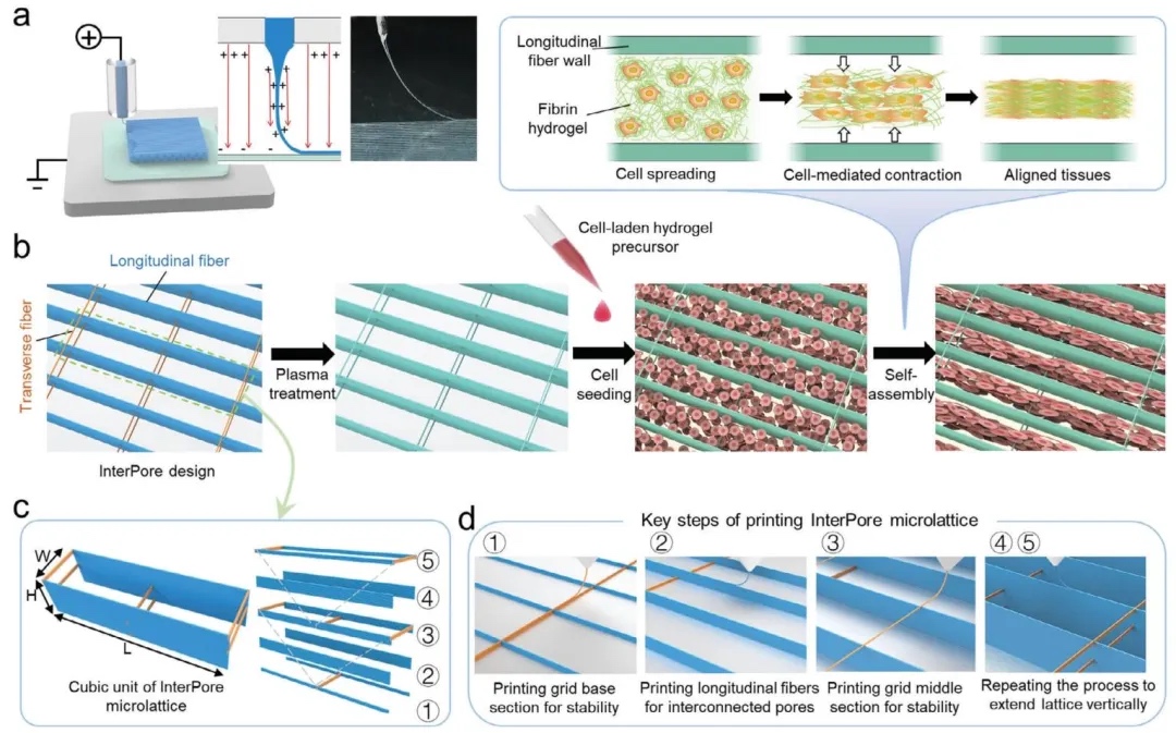 为解决这些痛点,西安交通大学的李涤尘/贺健康教授团队开发了InterPore微纤维晶格。该晶格是一种新型各向异性EHD打印支架,具有纵向互连孔,能满足心肌细胞高密度排列和电信号传播的结构连接需求。团队通过实验研究和有限元分析,揭示了细胞