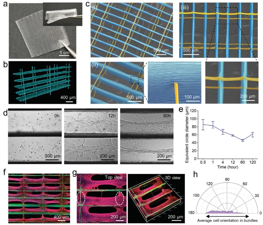 运用Micro-CT分析、扫描电子显微镜(SEM)成像和力学测试等方法,研究InterPore微纤维晶格的结构、机械性能及引导细胞排列的能力,结果显示该晶格具有明确的结构、足够的机械强度,能有效引导细胞自组装成排列紧密的细胞束。