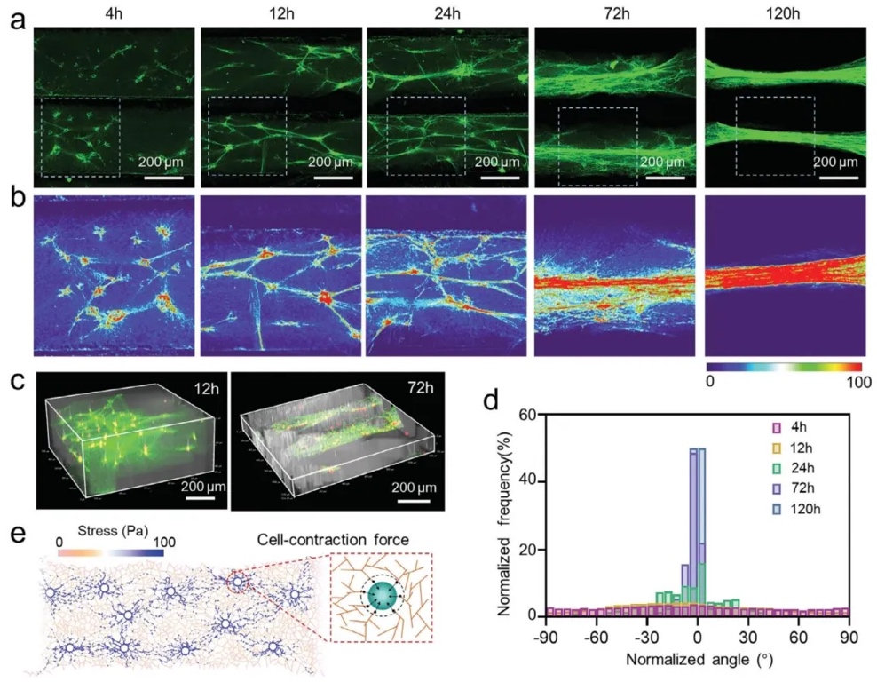 借助对不同时间点C2C12细胞在荧光纤维蛋白中成像及二维网络模型模拟,研究InterPore微纤维晶格内细胞介导的天然纤维水凝胶各向异性重塑过程,结果发现细胞能使纤维蛋白从随机排列逐渐转变为高度有序排列。