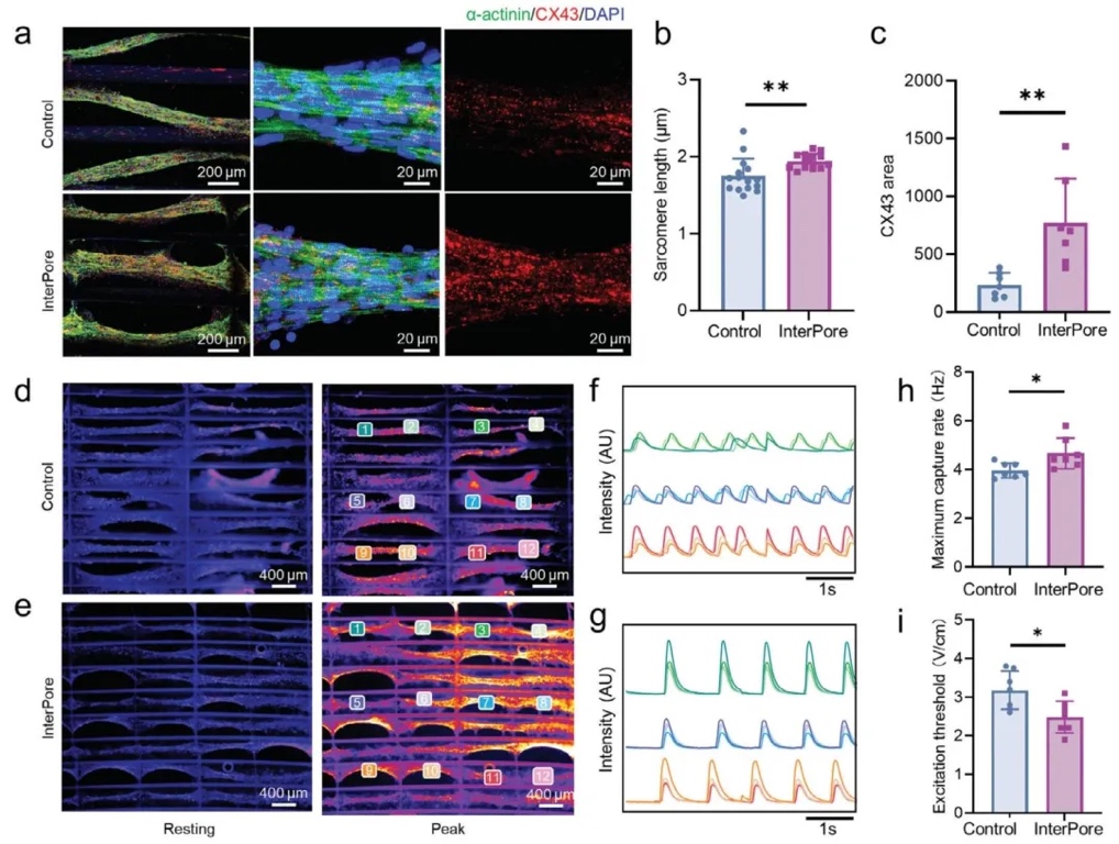 通过将新生大鼠心肌细胞接种到纤维蛋白水凝胶并在不同晶格中培养,研究InterPore微纤维晶格对心脏组织发育的促进能力,结果表明在该晶格中培养的心脏组织具有更成熟的结构和电生理活性。