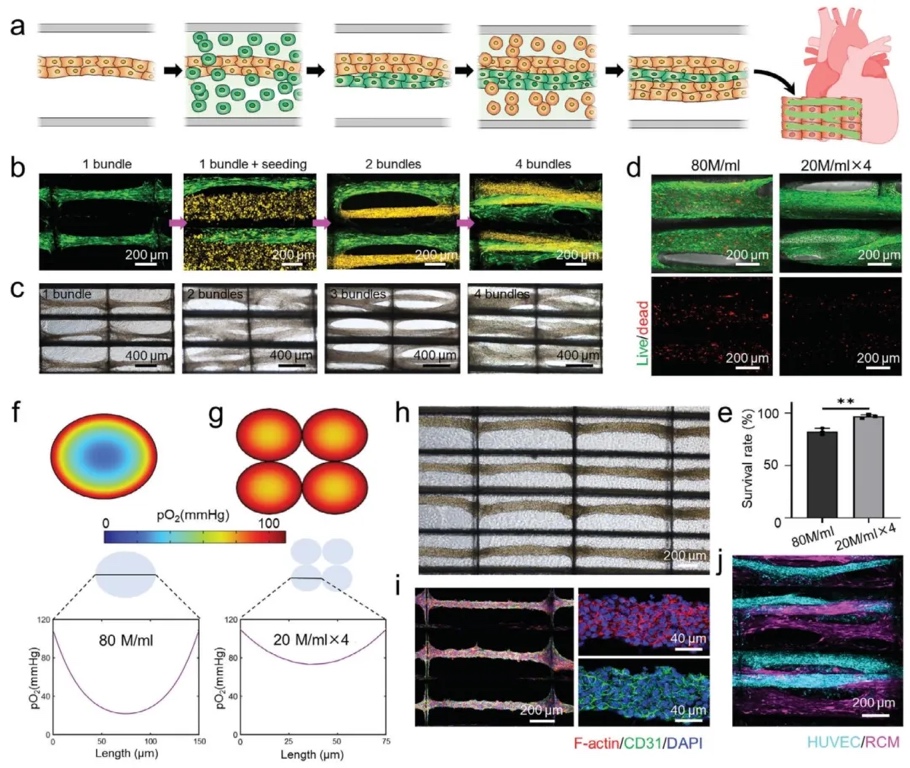 利用多次播种实验和有限元模拟,研究多次播种循环对InterPore微纤维晶格细胞负载和多细胞组织形成的影响,结果显示多次播种可提高细胞密度且维持高细胞活力,还能构建预血管化心脏组织。