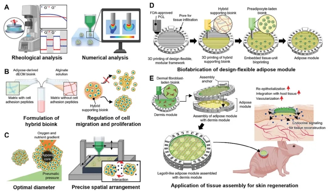Kim教授团队开发了一种快速组织打印方法,通过流变学和计算分析优化聚己内酯(PCL)框架,在0.3秒内挤出负载前脂肪细胞的生物墨水构建脂肪单元。针对前脂肪细胞迁移抑制脂滴形成的问题,团队研制出限制细胞迁移、促进脂肪细胞成熟的混合生物墨水,并计算出最佳脂肪单元直径(≤600μm)。此外,团队将脂肪模块与真皮模块整合,验证其内分泌功能。相关工作以“3D