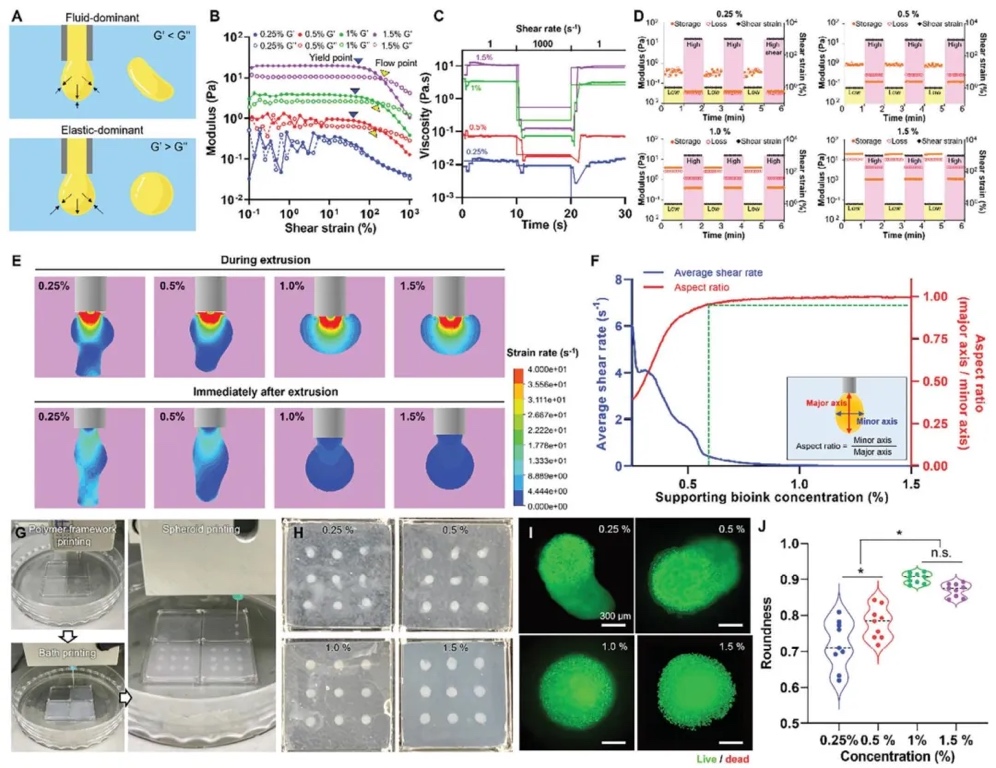 通过制备不同浓度的AdECM生物墨水并进行流变学测试、CFD模拟,研究了支撑生物墨水的流变特性对组织单元形状和稳定性的影响。结果表明,1%和1.5%浓度的生物墨水具有合适的弹性,能形成稳定的球形组织单元,确定1%浓度为后续实验的最佳选择。