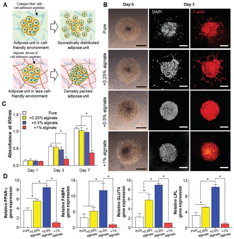 通过在1% AdECM生物墨水中添加不同浓度藻酸盐制备混合生物墨水,进行细胞培养和基因表达分析,研究其对前脂肪细胞迁移、增殖和分化的影响。结果显示,含0.5%藻酸盐的混合生物墨水能有效阻止细胞分散,促进局部增殖和早期成脂分化。