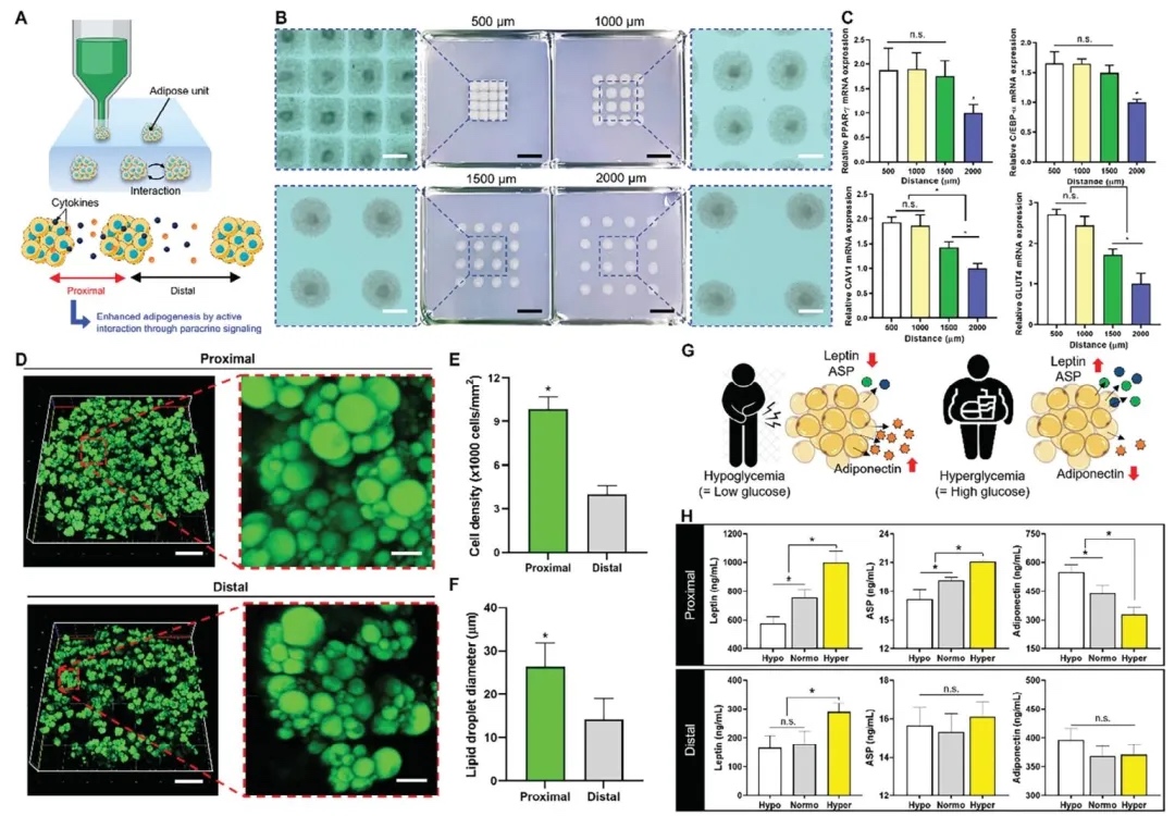 构建不同间距的脂肪模块,进行qRT-PCR分析、BODIPY染色及激素分泌检测,研究脂肪单元空间排列对成脂成熟和内分泌功能的影响。结果表明,较小间距(如1000μm)能促进成脂成熟,增强内分泌反应的动态功能。