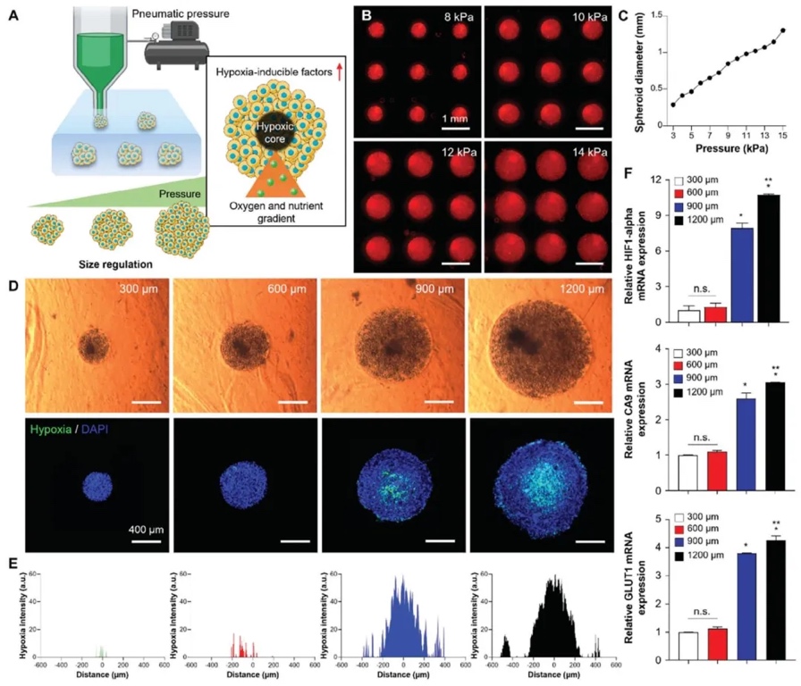 通过调节气动压力控制脂肪单元大小,使用缺氧检测试剂盒和基因表达分析,研究不同直径脂肪单元的缺氧情况。结果表明,直径600μm的脂肪单元能最大程度减少缺氧,保持细胞功能,后续实验均采用该尺寸。
