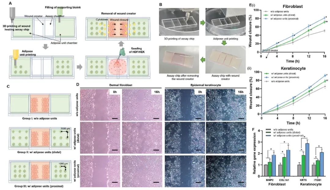 搭建3D打印辅助伤口划痕实验平台,引入脂肪单元与皮肤细胞共培养,观察细胞迁移和分析相关基因表达,研究脂肪模块内分泌信号对皮肤细胞迁移和伤口愈合的影响。结果显示,近端排列的脂肪单元显著促进伤口愈合,上调细胞迁移相关基因表达。
