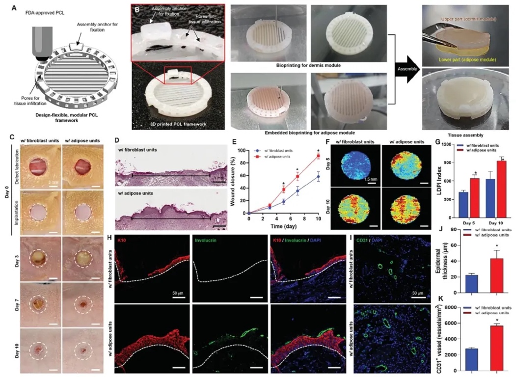 构建脂肪模块与真皮模块集成的组织组装体,植入裸鼠全层皮肤伤口模型,进行H&E染色、免疫组化等检测,研究其在体内促进伤口愈合的效果和机制。结果表明,含脂肪单元的组织组装体显著加速伤口愈合,促进血管化和再上皮化。