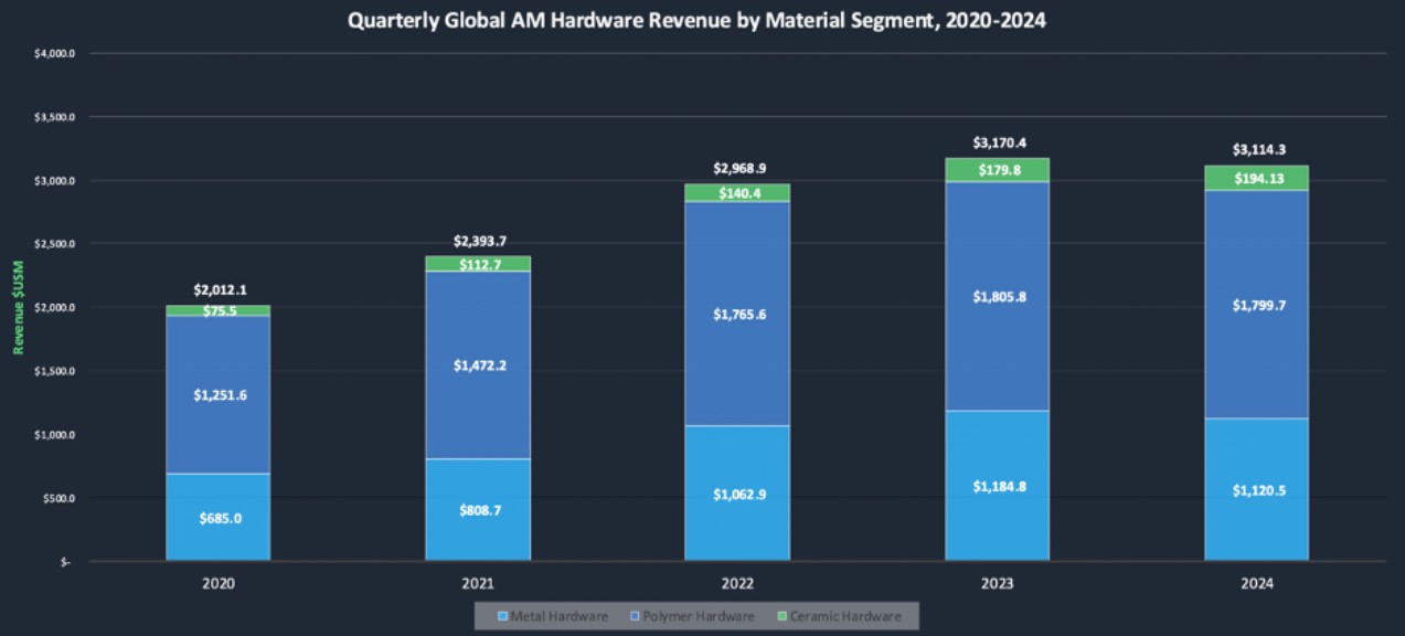 AM Research 的季度跟踪包括金属、聚合物和陶瓷 3D 打印技术的综合数据,涵盖硬件、材料和服务。2024 年第四季度总市场规模达到 36.8 亿美元,高于第三季度的 34.9 亿美元,环比增长近 5.5%。金属增材制造全年收入 55.8 亿美元,仅第四季度就达到 14.5 亿美元。聚合物增材制造仍然是最大的硬件和材料类别,年收入 78 亿美元,其中 20 亿美元来自最后一个季度。虽然两个市场都出现了季度增长,但并未完全弥补早先因资本支出递延和持续的经济不确定性而导致的放缓。