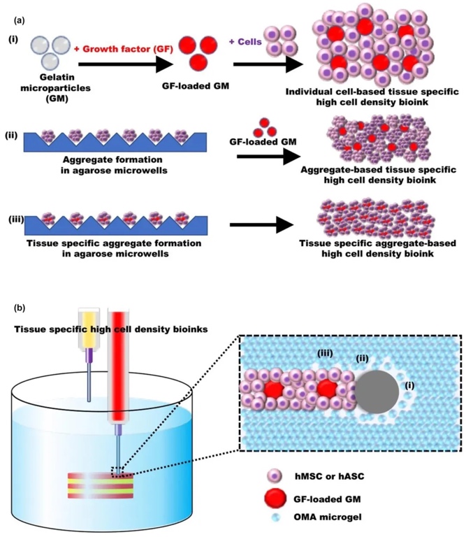 Alsberg教授团队合作,提出一种创新策略来解决这些痛点。他们将组织特异性高细胞密度生物墨水3D打印到光交联可降解水凝胶微颗粒支撑浴中,制备出新型生物制造组织。通过在生物墨水中加入负载生长因子的明胶微颗粒,不仅实现生长因子的持续释放和精准调控,还成功制备出多种组织特异性生物墨水,构建出如骨软骨组织等多相组织。相关工作以“Biofabrication