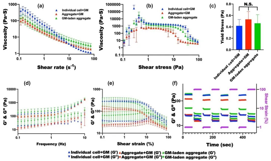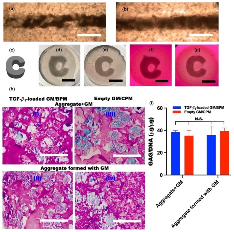 5. 通过3D打印基于细胞聚集体的生物墨水并进行软骨分化实验,研究该生物墨水的打印性能和软骨形成能力。结果表明,该生物墨水打印的结构具有高分辨率和形状保真度,经软骨分化后能形成软骨组织,与阳性对照组无显著差异,验证了其在组织工程中的应用潜力。