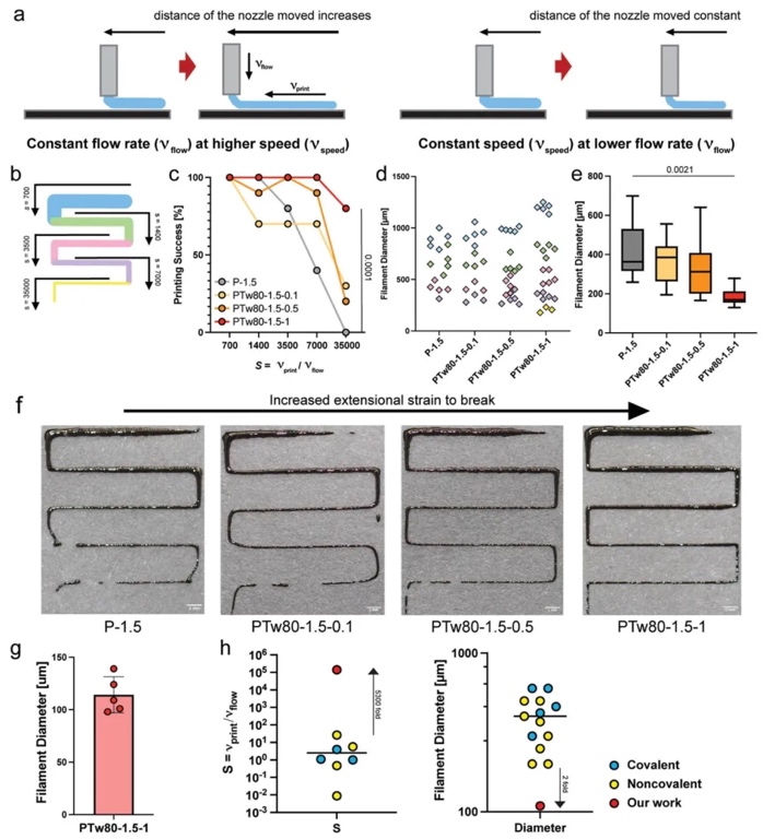 本研究通过将疏水改性的纤维素基聚合物与多种生物材料混合,开发出一种可调节的水凝胶平台。流变学研究表明,添加化学添加剂能够在不改变水凝胶刚度的情况下,调节其粘弹性和应力松弛行为,实现流变特性的选择性控制。丝状拉伸拉伸流变仪测试发现,添加Tw80显著提高了水凝胶的延展性,在Tw80浓度最高的水凝胶中,拉伸断裂应变高达2000%。在3D打印实验中,该水凝胶的高速打印性能显著提升,速度因子提高了5000多倍,有效解决了打印细丝断裂和均匀性丧失的问题。研究结果表明,通过调整水凝胶成分优化其延展性,为高速3D打印带来了新的突破,有助于更高效、精准地制造复杂且功能完备的组织。