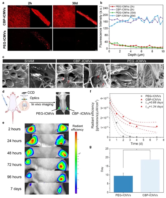 CBP-ICMVs在体外和体内延长软骨驻留时间并穿透软骨细胞外基质:运用共聚焦显微镜观察、扫描电镜(SEM)、体内成像系统(IVIS)等技术,以兔软骨切片和小鼠膝关节为研究对象,探究CBP-ICMVs的穿透和滞留能力。结果显示,CBP-ICMVs在体外能快速穿透并长时间滞留在软骨细胞外基质中,其荧光强度在2小时和30天时均显著高于对照的PEG-ICMVs;在体内,CBP-ICMVs在小鼠膝关节中的滞留时间明显长于PEG-ICMVs,关节内半衰期从0.66天延长至1.34天,提高了药物递送效率。