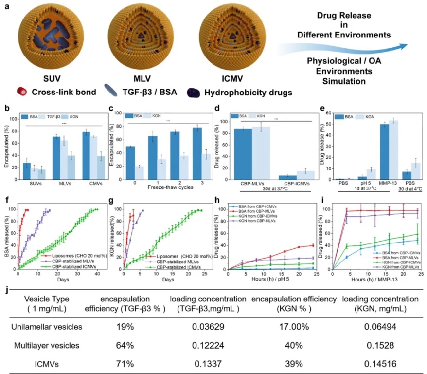 ICMVs负载药物的生物活性保留:通过测定不同阶段ICMVs对模型蛋白(BSA、TGF-β3)和疏水性药物(KGN)的包封率、药物释放动力学以及在不同环境下的稳定性,研究ICMVs对负载药物生物活性的保留能力。结果表明,ICMVs的载药量随合成步骤增加,对TGF-β3和KGN的包封率分别约为70%和39%;在37℃的PBS缓冲液中,ICMVs能显著延长药物释放时间,在模拟OA微环境中也表现出良好的稳定性。