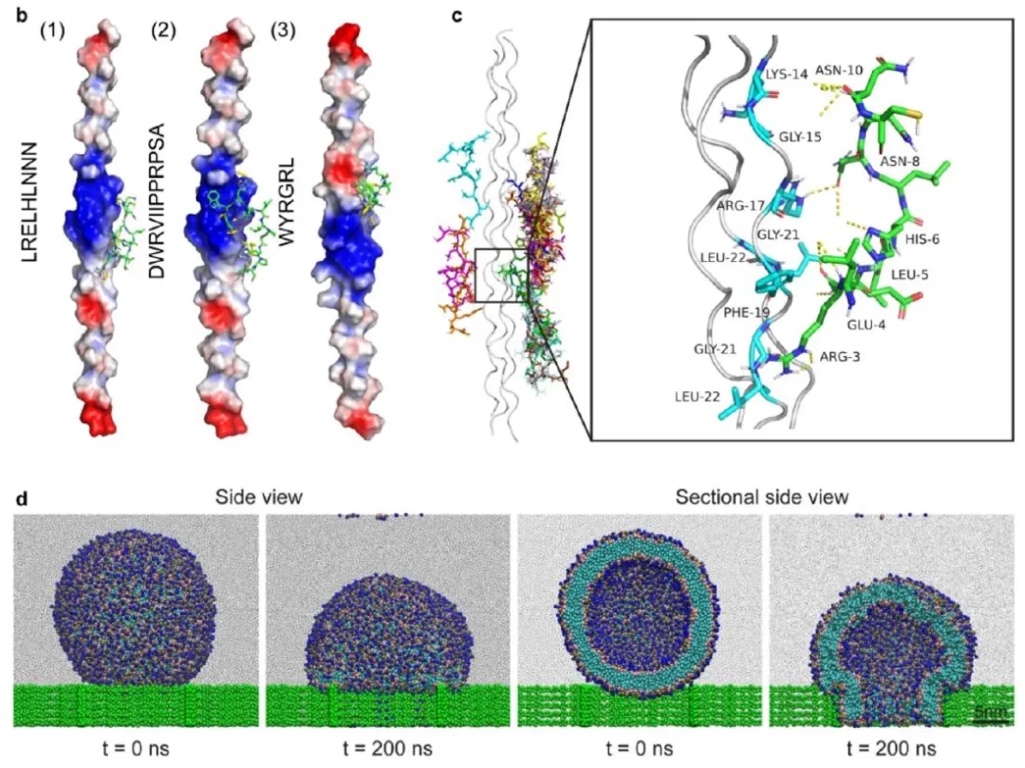 人源II型胶原蛋白与三种选定肽的结合模式评估:采用分子对接和粗粒化分子动力学(MD)模拟的方法,研究三种肽(LRELHLNNN、DWRVIIPPRPSA、WYRGRL)与II型胶原蛋白的结合亲和力和结合模式,以及脂质体穿透软骨细胞外基质的能力。结果表明,LRELHLNNN与II型胶原蛋白的结合亲和力最高,为-7.7kcal/mol;MD模拟证实了脂质体可通过结构变形穿透比自身直径小的网格结构,验证了其穿透软骨细胞外基质的能力。