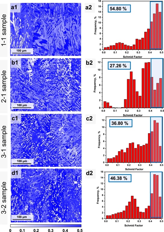 织构与滑移系激活方面,当 VED 较高,大于 90 J/mm³ 时,(0001)α 织构强度会降低,这一变化促进了多滑移系的激活。具体来说,Schmid 因子大于 0.4 的区域占比能够达到 54.8%,从而显著提升了合金的延展性。