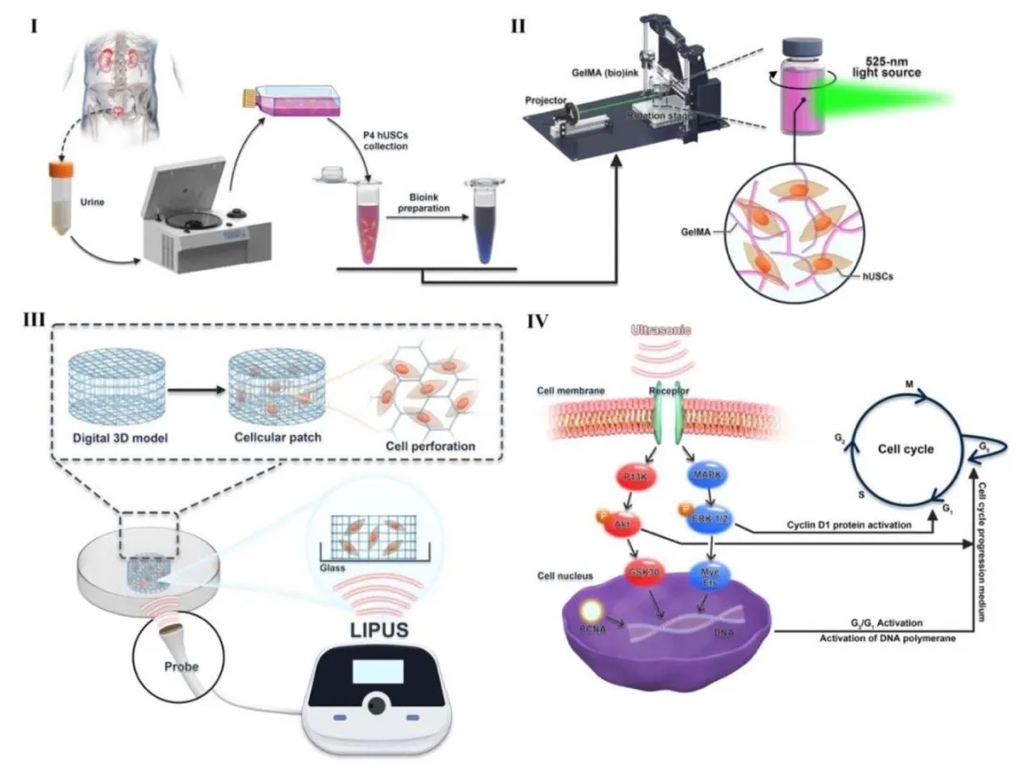 本研究表明,低强度脉冲超声(LIPUS)可促进 3D GelMA 支架中人尿源性干细胞(hUSCs)的增殖,这可能是通过激活 ERK1/2 和