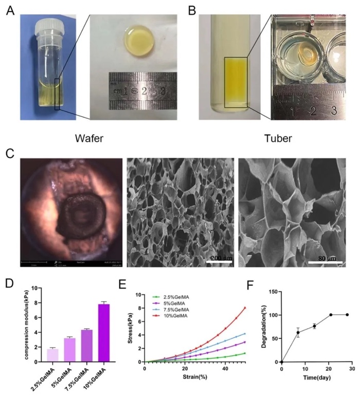 将GelMA粉末溶解在PBS中,添加交联剂和hUSCs制备生物墨水,利用3D打印技术构建支架,采用扫描电子显微镜(SEM)观察其微观结构,通过压缩测试获取应力