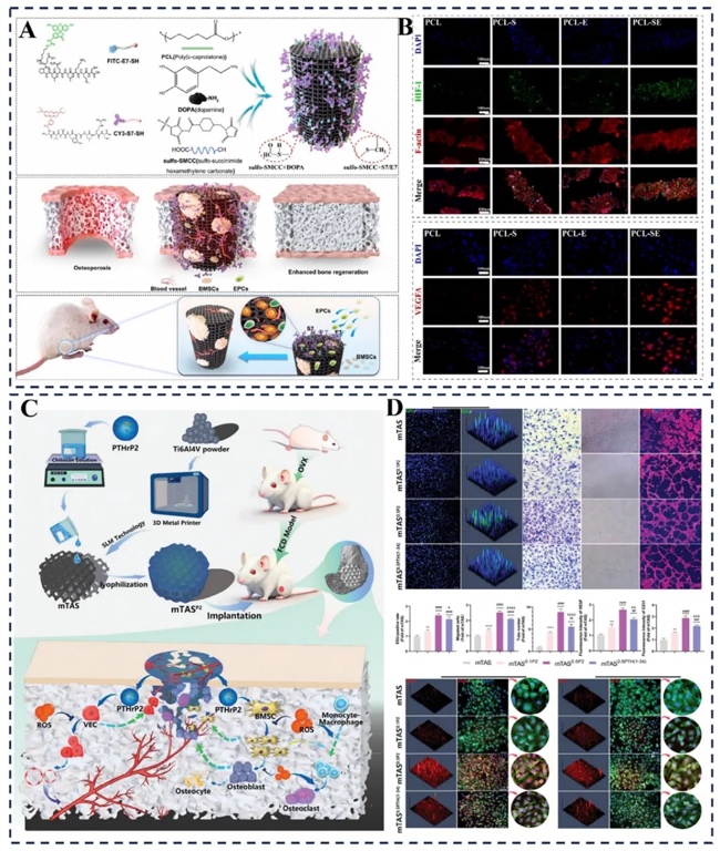 8. 血管化骨修复支架在骨质疏松性骨缺损中的应用:介绍了3D打印的PCL支架和甲状旁腺激素相关肽结合的3D打印大孔钛支架在骨质疏松性骨缺损治疗中的应用。这些支架可调节骨代谢稳态,促进血管生成和细胞增殖,为骨质疏松性骨缺损的修复提供了有效手段。